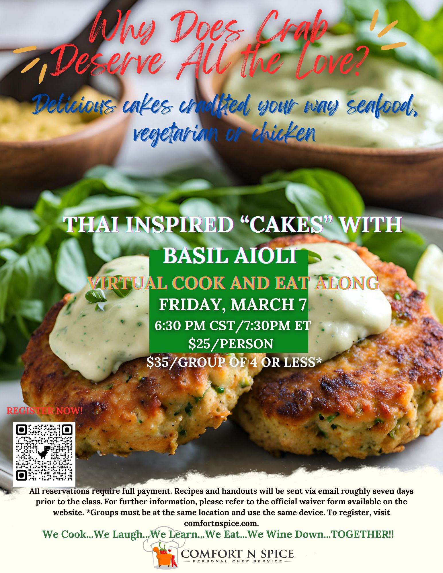 All reservations must include payment in full. Recipes and handouts will be provided via email approximately 7 days before class time. Please reference the official waiver form for additional details. *Group at the same location using the same device. Past classes are available for private offerings